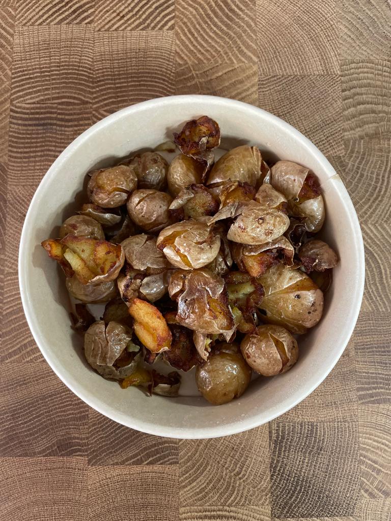 Poulet, bacon, oignon, mayonnaise moutarde à l'ancienne avec pommes de terre frappées ou salade verte